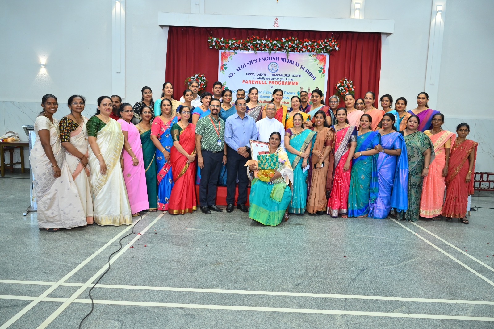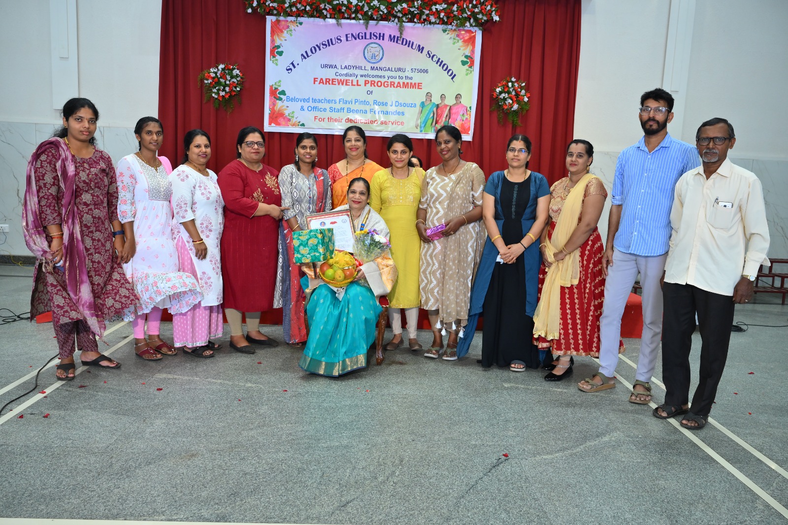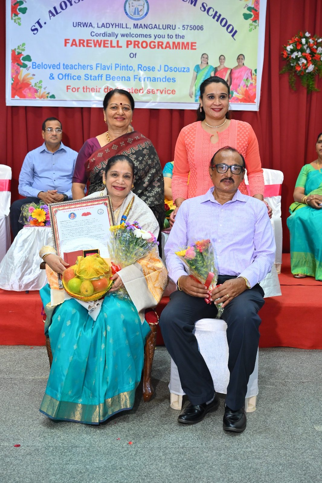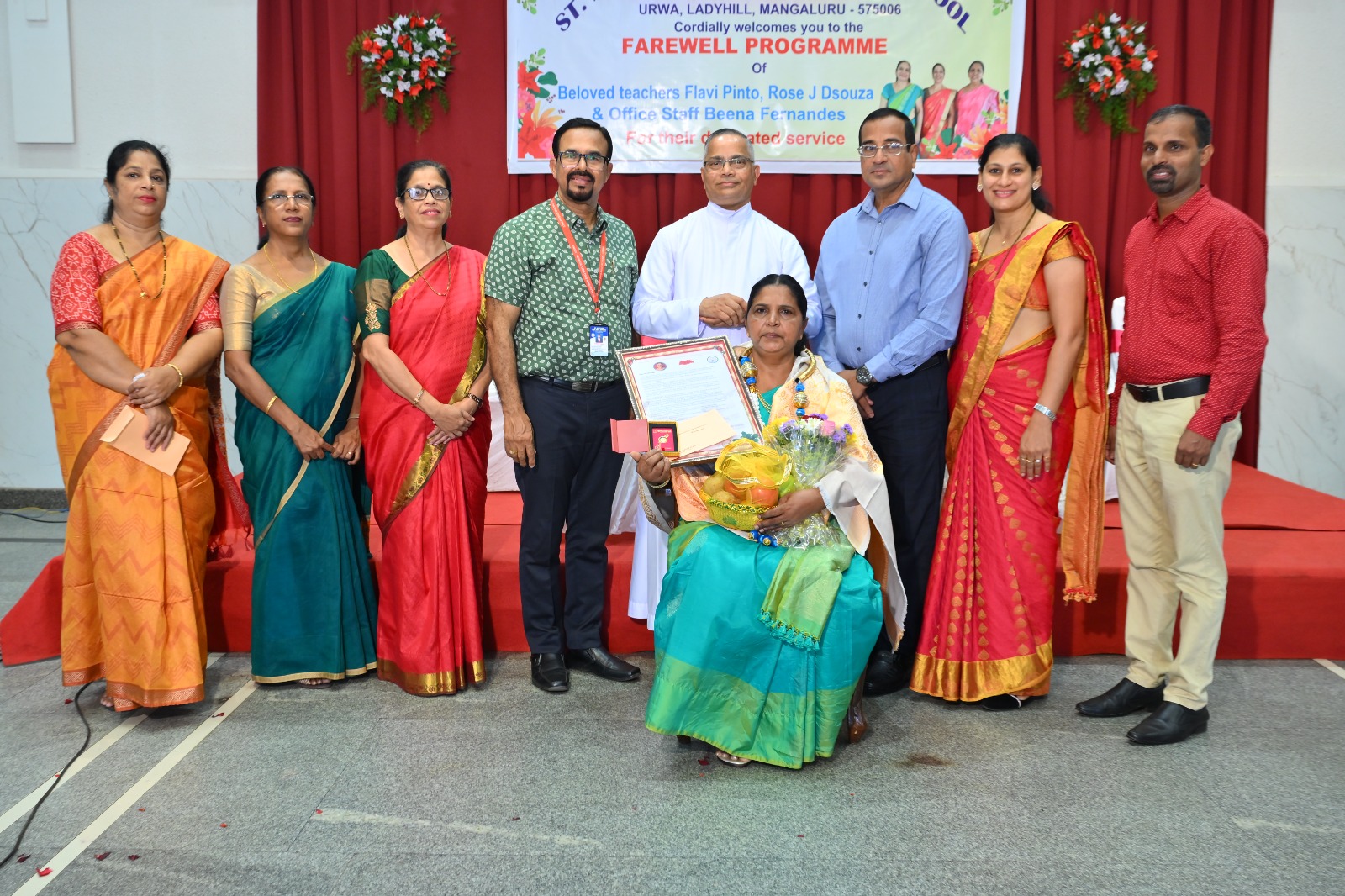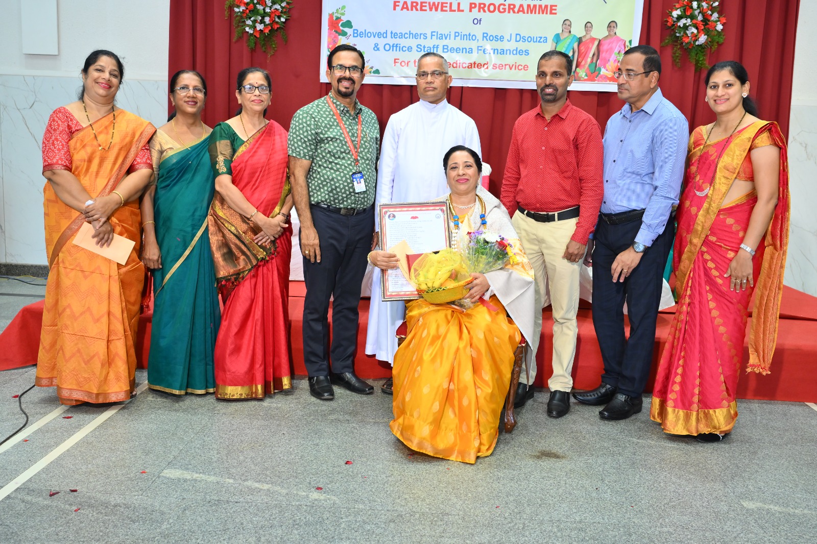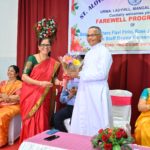 The highlight of the ceremony was the reading of the citations, acknowledging the dedication and service of Mrs. Falvi Pinto citation was read by Sir Raj Kiran, Mrs. Rose D’Souza citation was read by teacher Laveena Pinto, and Mrs. Beena Fernandes citation was read by Mr. Cyril Crasta. They were then felicitated with a shawl, garland, fruits, flowers, and gifts as a token of respect and admiration.