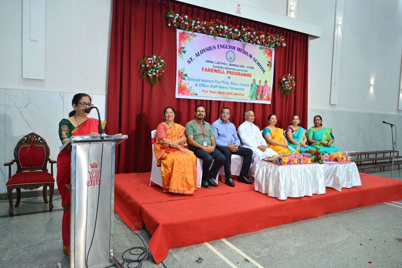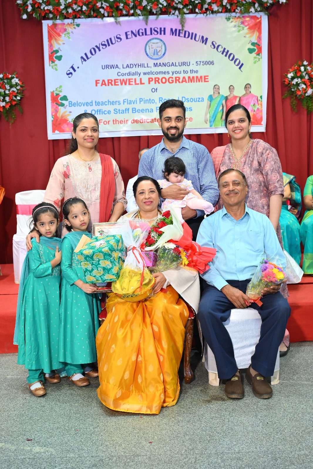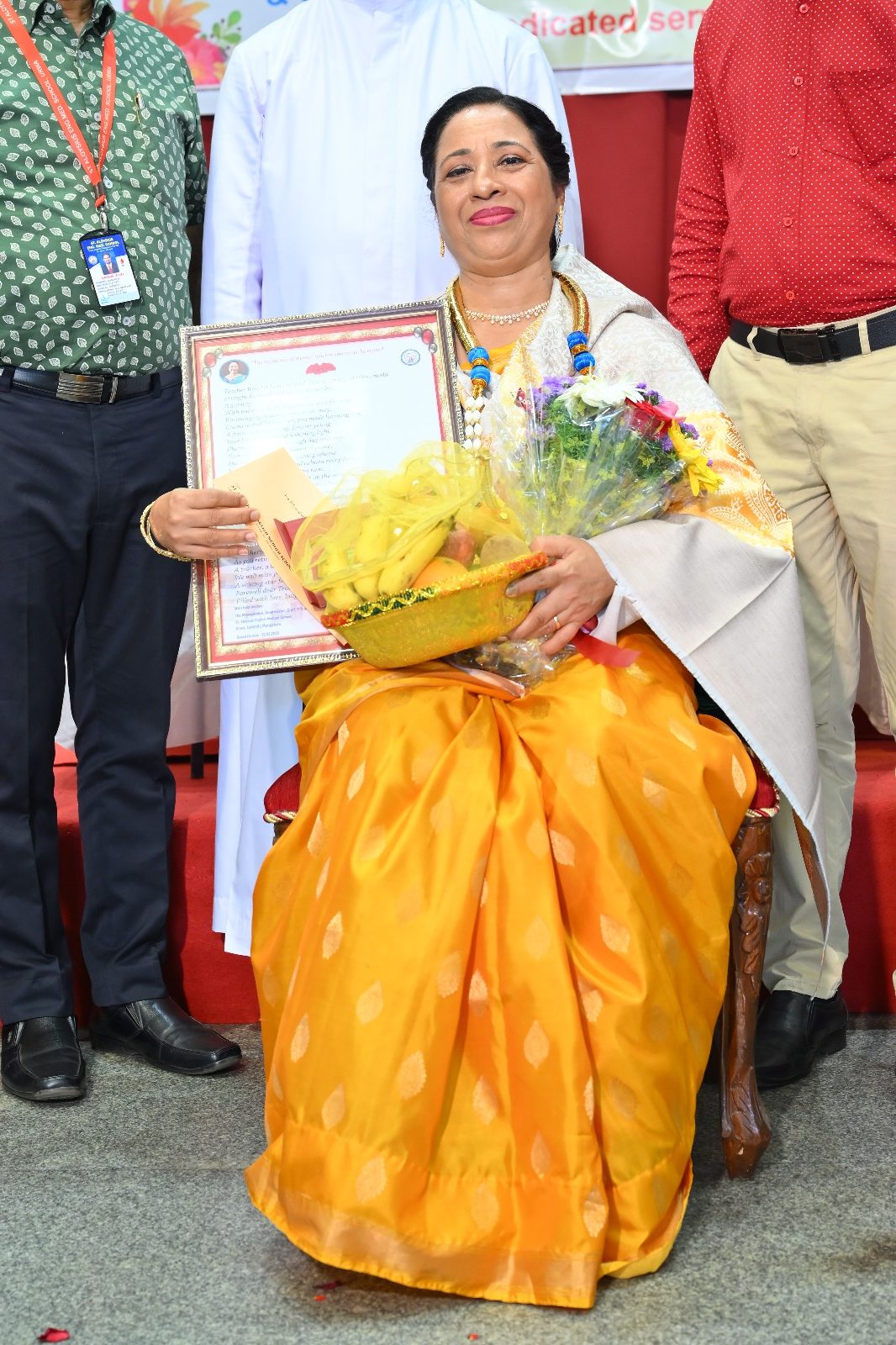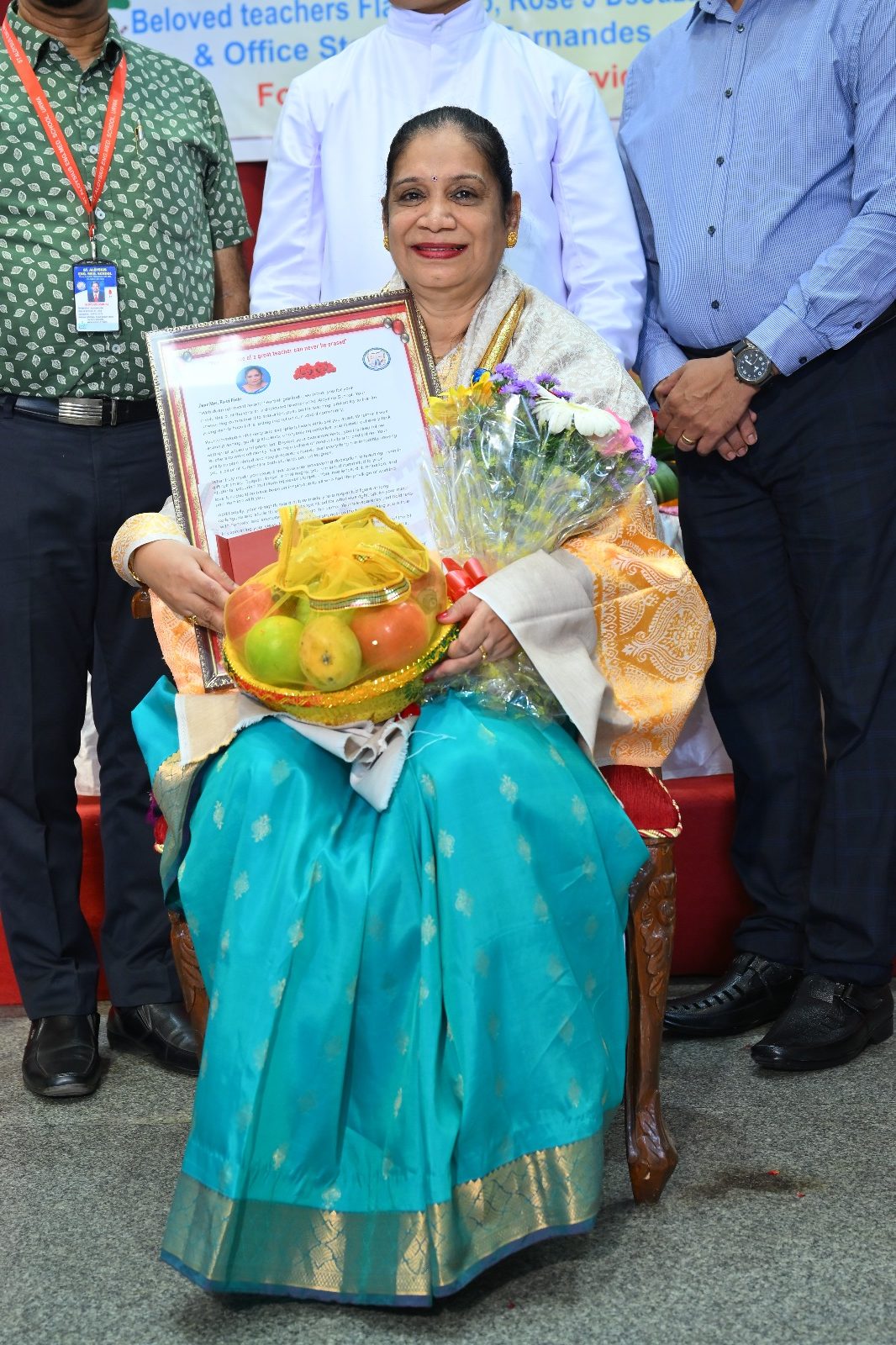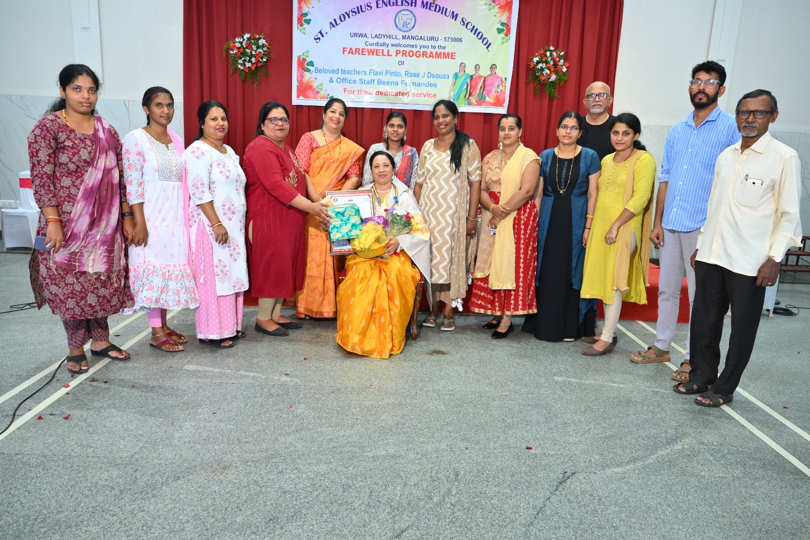 The highlight of the ceremony was the reading of the citations, acknowledging the dedication and service of Mrs. Falvi Pinto citation was read by Sir Raj Kiran, Mrs. Rose D’Souza citation was read by teacher Laveena Pinto, and Mrs. Beena Fernandes citation was read by Mr. Cyril Crasta. They were then felicitated with a shawl, garland, fruits, flowers, and gifts as a token of respect and admiration.