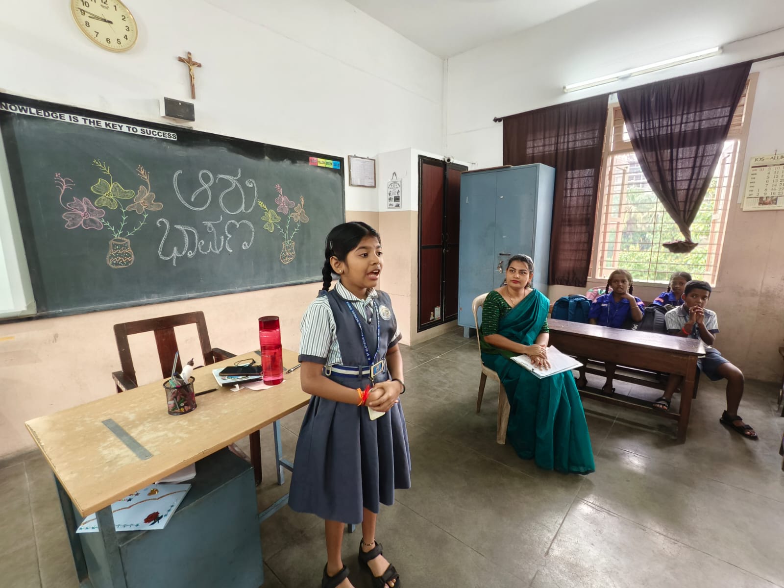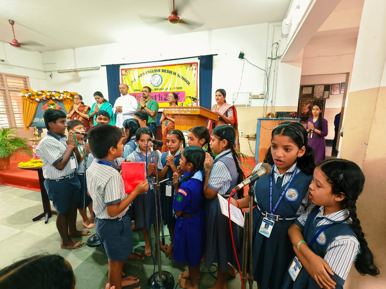 The inaugural program was anchored by Teacher Rina D’Souza, with the event being coordinated by in-charge teachers Tr. Poornima, Tr. Laveena Lobo, and Tr. Rina D’Souza. The ceremony began with a melodious prayer song by the students of Class IV, setting a soulful tone for the day. This was followed by the lighting of the lamp by the dignitaries – Chief Guest Rev. Fr. Micheal Lobo, Headmaster Mr. Aloysius D’Souza, PTA Vice President Mrs. Pushpanjali, Senior Teacher Mrs. Laveena D’Cunha, and Mrs. Laveena Pinto, accompanied by the student leader.
