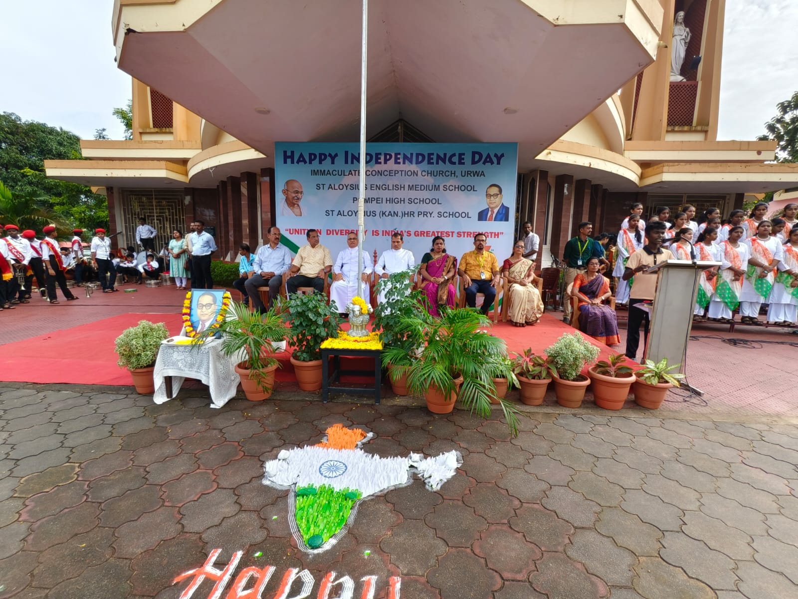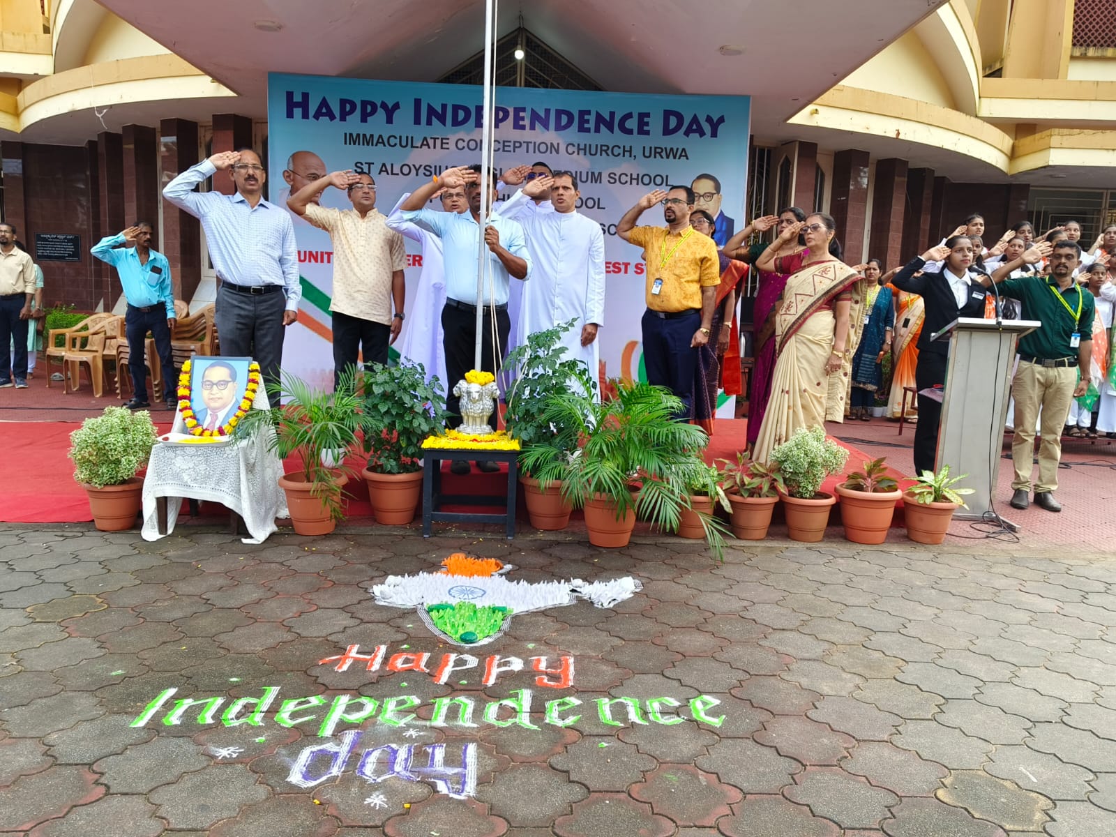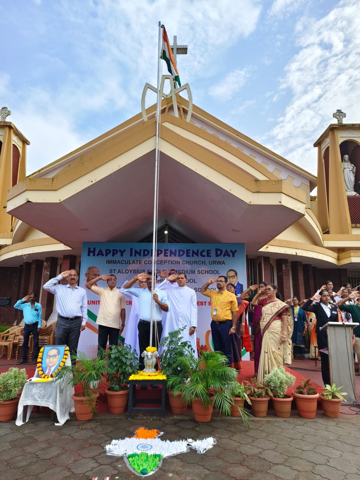 St Aloysius English Medium School, Urwa, joyfully celebrated the 79th Independence Day of our nation on 15th August 2025 at the Urwa Church grounds, with great pride and patriotism. The programme commenced with the welcome of dignitaries – Correspondent Rev. Fr. Benjamin Pinto, Asst. Priest Fr. Lanson Maxim Pinto, Chief Guest Rev. Fr. Rajesh Melwin Rosario – Rector – St. Joseph’s Interdiocesan Seminary Jeppu, Mr. Loyd Lobo Vice president – Parish Pastoral Council, Headmaster Mr. Aloysius D’Souza, Headmistress of St Aloysius Kannada Medium School, and the Headmistress Pompei High school. Urwa.